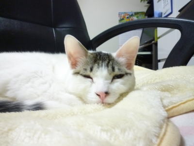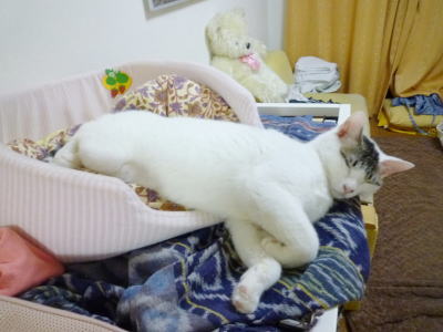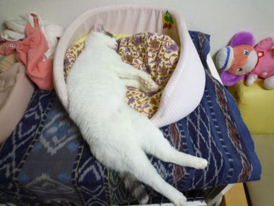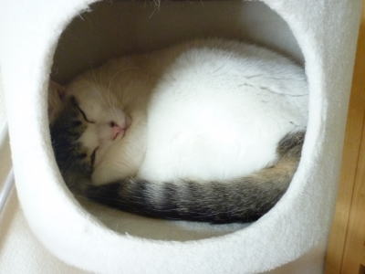 昼間の寝場所はキャットタワーのねこちぐらの中が多いのですが、